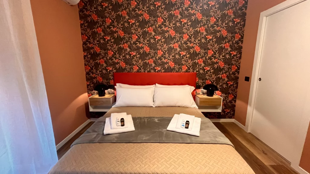 Una matrimoniale accogliente, con una tappezzeria con fiori rossi su fondo scuro sulla parete della testiera del letto. Una tonalità cammello per le altre pareti per sentirsi avvolti in un atmosfera di serena, rilassante  passione.